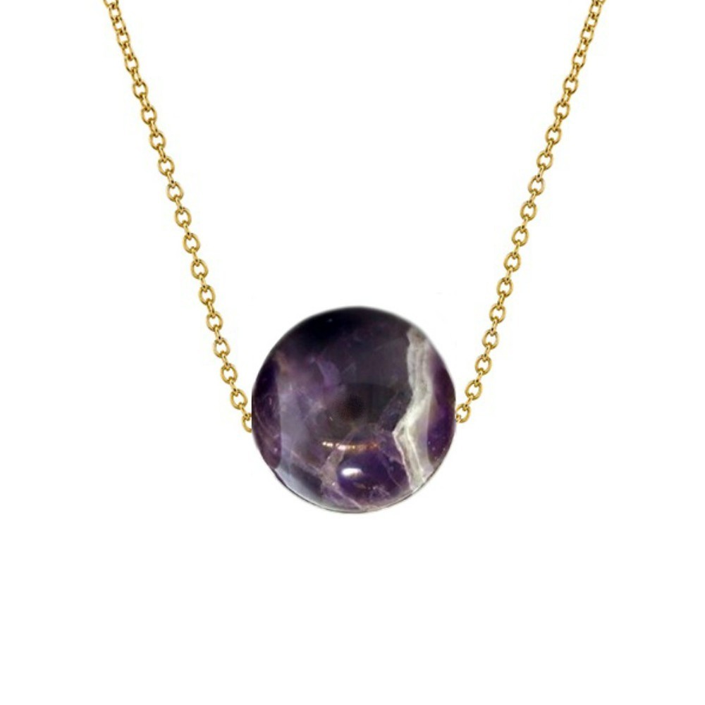 Un colier delicat, o piatra semipretioasa de ametist de 10 mm, rotunda, pe un lantisor din aur de 14 karate.