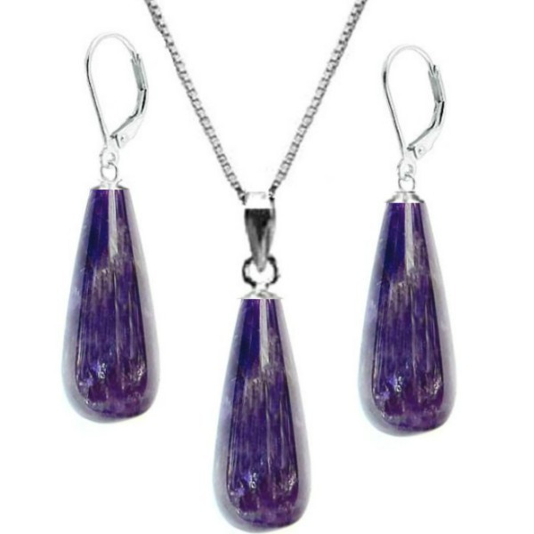 Set din argint si pietre semipretioase de ametist lacrima, compus din pandantiv si cercei. Lantisorul de argint este inclus si are o lungime de aproximativ 43 cm, dar, la cerere, poate avea si alte dimensiuni. Piatra semipretioasa are dimensiunea de 25 x 10 mm, lungimea totala a cerceilor fiind de aproximativ 3,5-4 cm. Lantisorul, montura pandantivului si montura cerceilor sunt din argint 925. Este un set elegant, usor de asortat, plin de culoare.