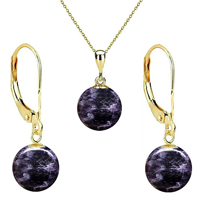 Setul este compus dintr-un colier cu pandantiv din aur si o pereche de cercei din aur cu pietre semipretioase naturale de ametist , rotunde, de 10 mm.