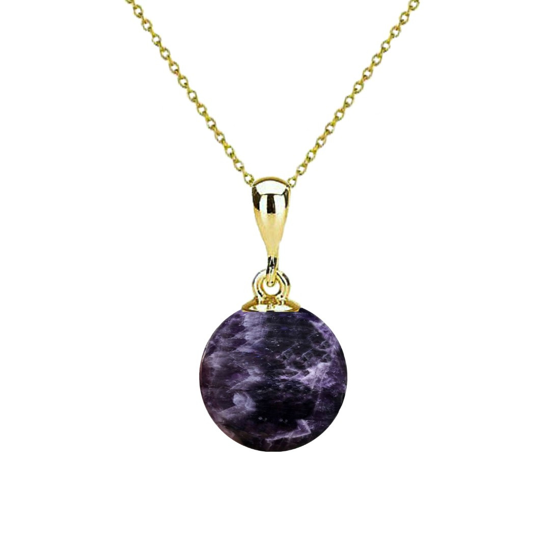 Un pandantiv din aur galben de 14 karate cu o piatra semipretioasa naturala de ametist, marimea 8 mm, pe un lantisor de aur galben de 14 karate. . Lungimea lantisorului de aur galben de14 karate este de 45 cm.
