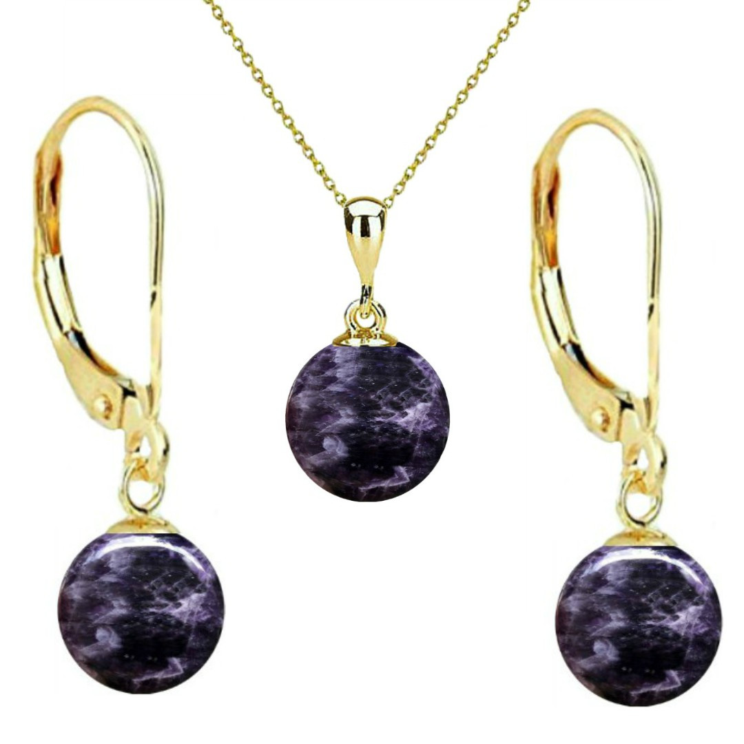 Setul este compus dintr-un colier cu pandantiv din aur si o pereche de cercei din aur cu pietre semipretioase naturale de ametist , rotunde, de 8 mm.
