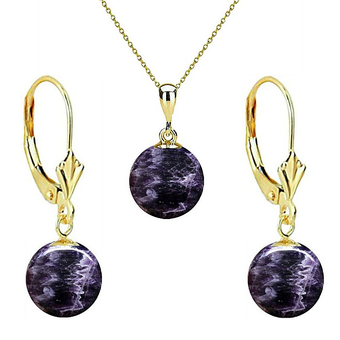 Setul este compus dintr-un colier cu pandantiv din aur si o pereche de cercei din aur cu pietre semipretioase naturale de ametist , rotunde, de 10 mm.