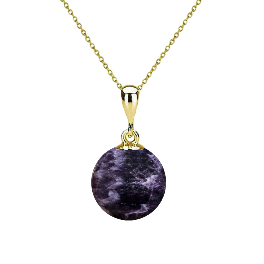 Un pandantiv din aur galben de 14 karate cu o piatra semipretioasa naturala de ametist, marimea 10 mm, pe un lantisor de aur galben de 14 karate. Lungimea lantisorului de aur galben de14 karate este de 45 cm.