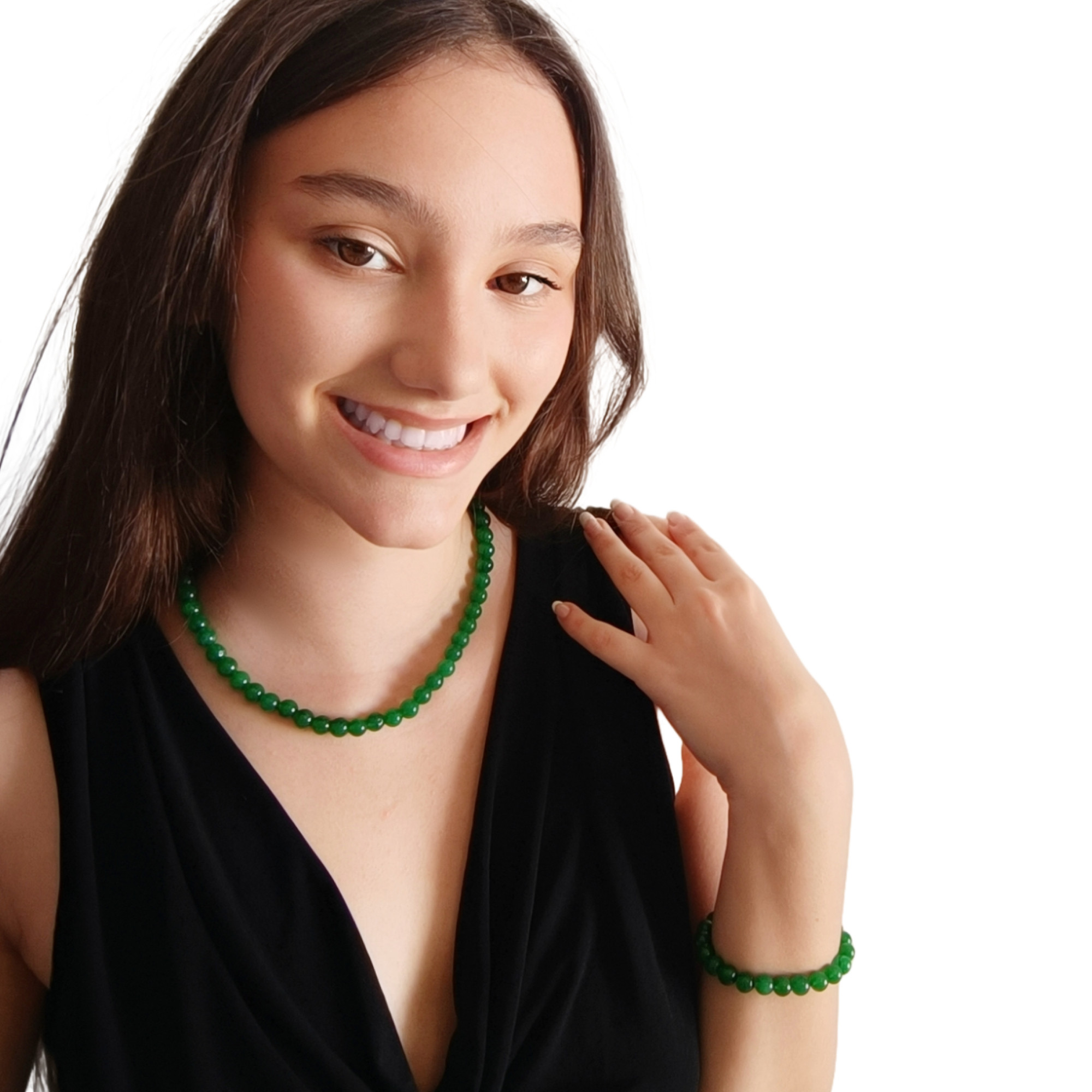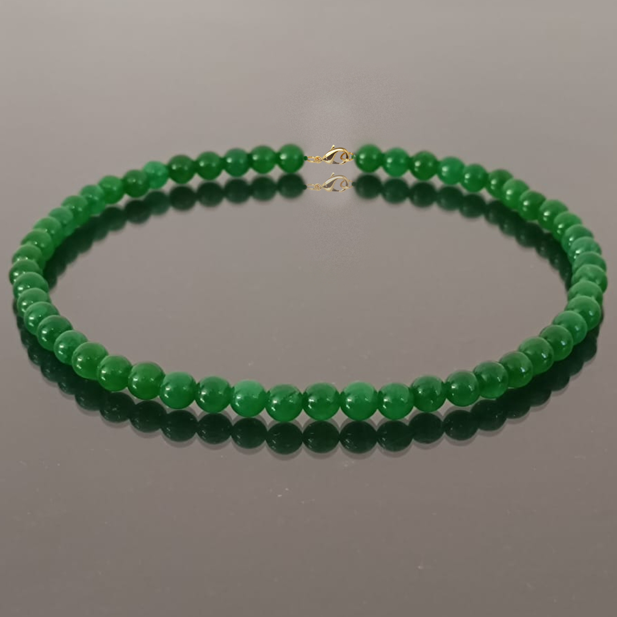 Un colier de o eleganta clasica, cu jad natural malaesian de 8mm, creat sub brandul KASKADDA, marca inregistrata in 27 de tari in Europa.