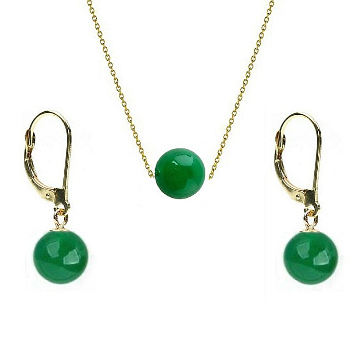 Setul contine un colier si o pereche de cercei cu jad natural malaesian. Lantisorul colierului si montura cerceilor sunt din aur de 14k, iar jadul este natural, malaesian de 8 mm. Lungimea colierului este de 45 cm. Pentru dimensiuni speciale va rugam sa ne contactati. Un set elegant potrivit pentru orice varsta si orice tinuta.