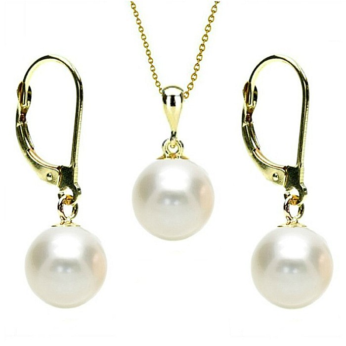 KASKADDA® Set Perle – Colier cu Pandantiv și Cercei, Aur 14K, Perle Naturale Albe 8 mm | KASKADDA®