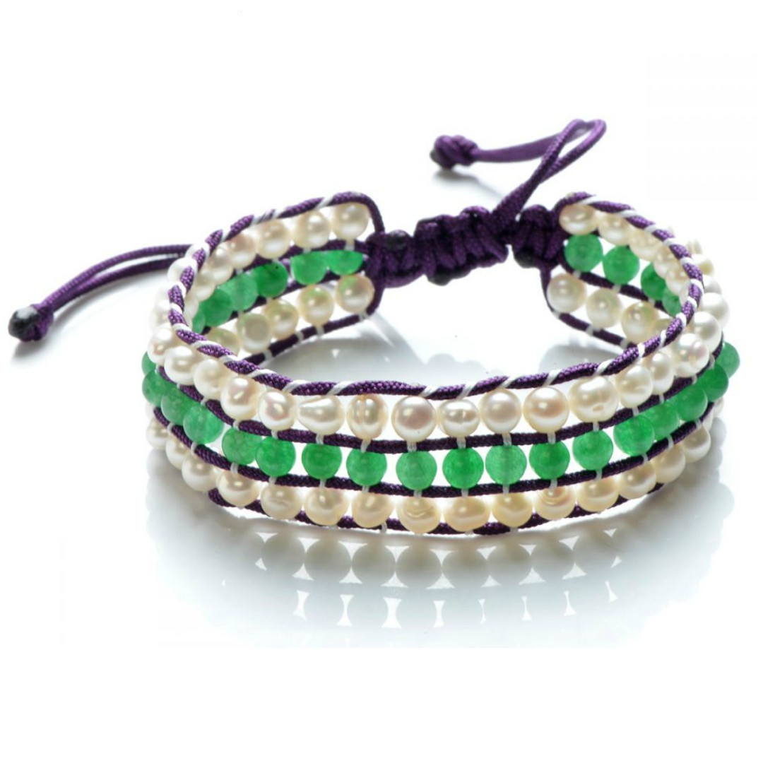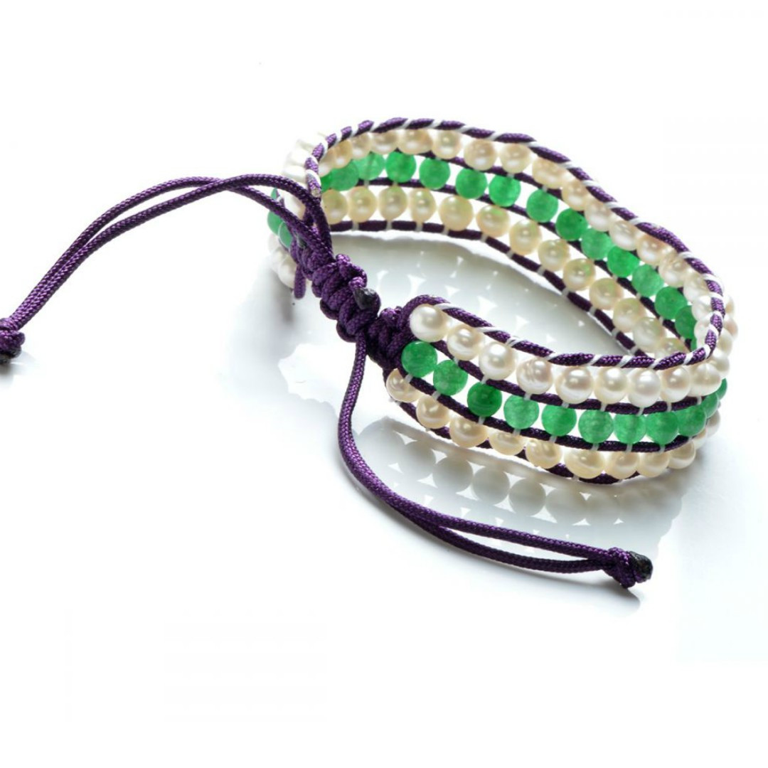 Brățara este formată din trei rânduri de mărgele: perle de cultură, naturale, de apă dulce și jad natural malaesian, ambele în dimensiuni de 4-5 mm și cu formă rotundă, montate pe un șnur cerat durabil. Modelul are lungime ajustabilă, ceea ce o face ușor de adaptat oricărei încheieturi – ideală pentru purtare zilnică sau în completarea unui stil boho-chic.