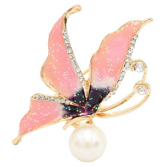 Brosa in forma de fluture, realizata din aliaj metalic cu o perla naturala de cultura, de culoare alba, forma buton, de 7,5-8 mm, colorata cu email si decorata cu zirconii cubice. Dimensiunile brosei sunt de 50/42 mm.
