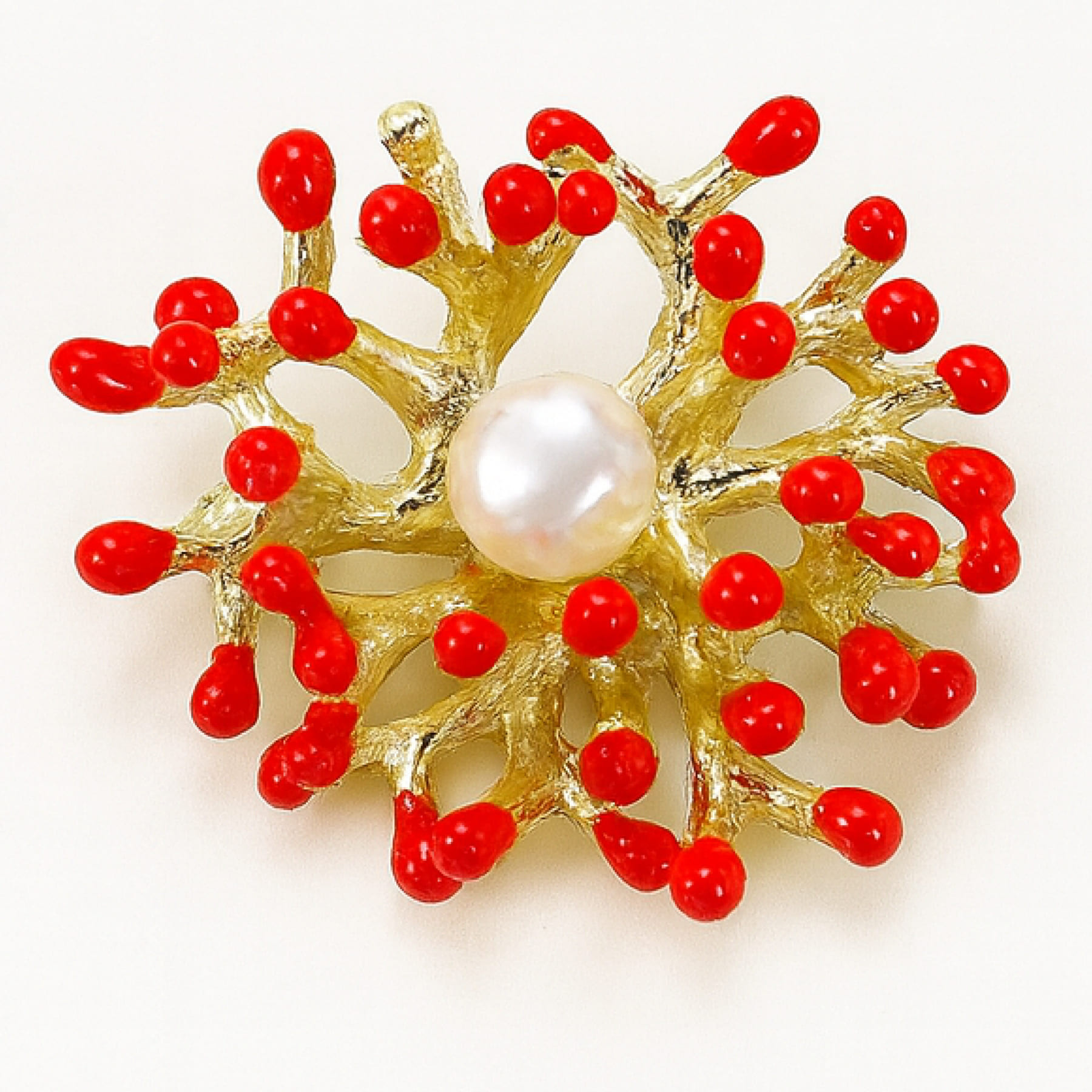 Ramurile aurii acoperite cu elemente roșii lucioase creează un efect vizual vibrant, aducând aminte de coralii marini. Perlă naturală amplifică contrastul și oferă un element de rafinament, transformând broșa într-o piesă care iese în evidență fără efort.