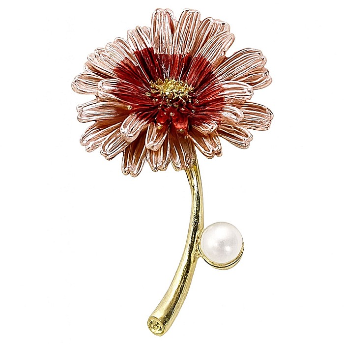 Designul floral, inspirat de margareta clasică, creează un efect vizual expresiv, fără a fi încărcat. Petalele red–coral sunt lucrate atent, iar centrul auriu conferă broșei o notă sofisticată. Este o alegere inspirată pentru momente în care dorești să adaugi un accent cald, plin de viață ținutelor tale.