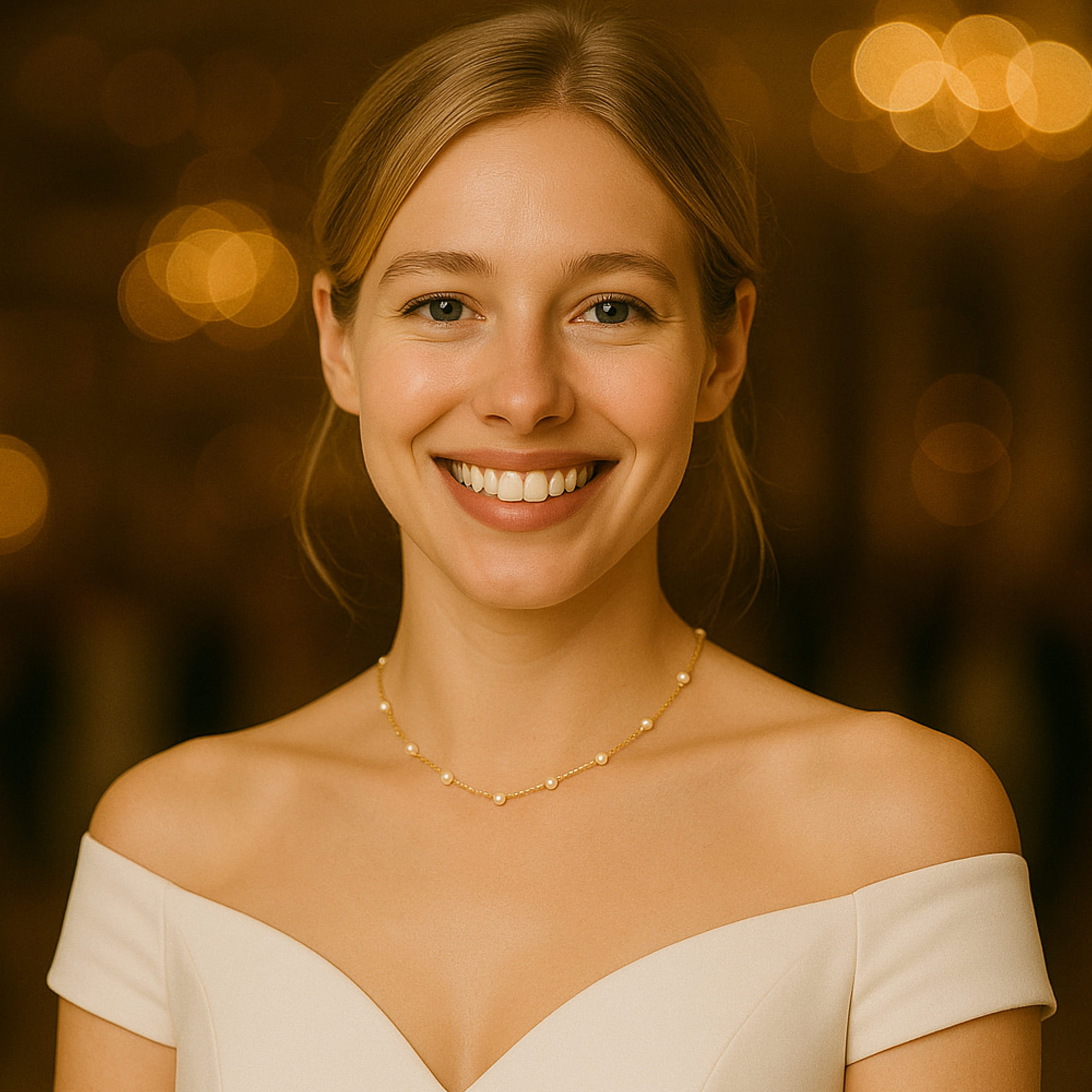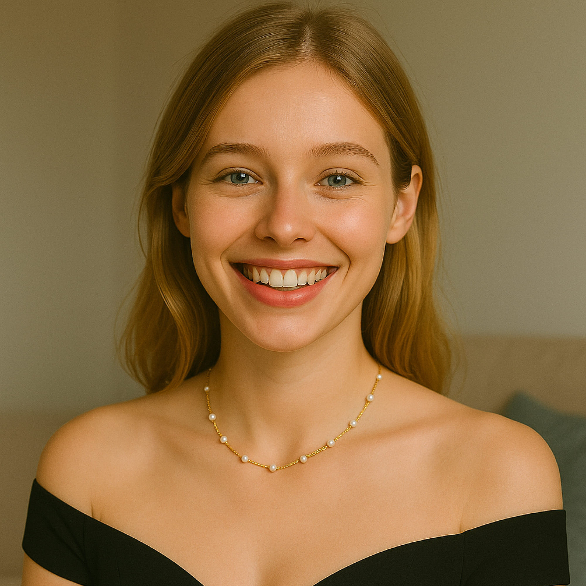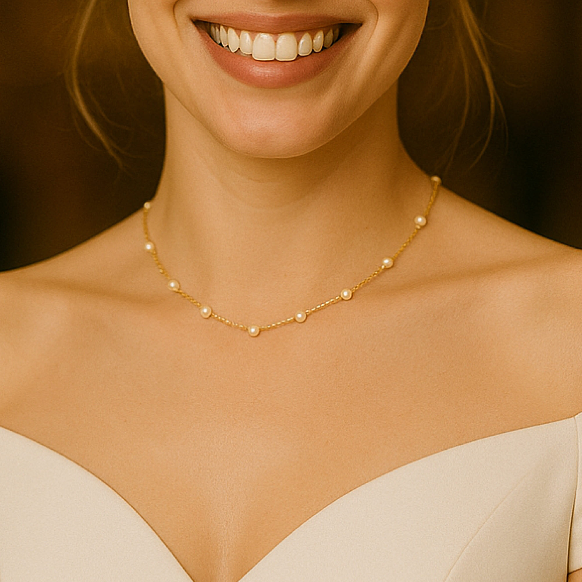 Un colier cu perle naturale mici, albe, de 4–5 mm, montate  pe un lănțișor subțire din aur 14K (aur 585). Designul său discret și elegant îl face ușor de purtat, atât în zilele obișnuite la birou, cât și la ocazii speciale. O bijuterie feminină și versatilă, potrivită pentru a fi purtată cu plăcere sau oferită cu drag.