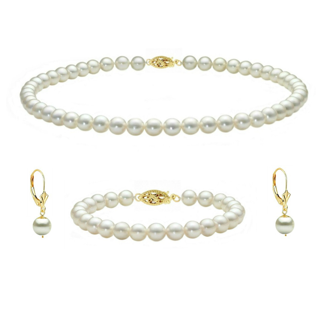 Set Perle Akoya Japoneze 7–7,5 mm – Colier, Brățară și Cercei cu Închizători Filigranate, Aur Galben 14K | KASKADDA®