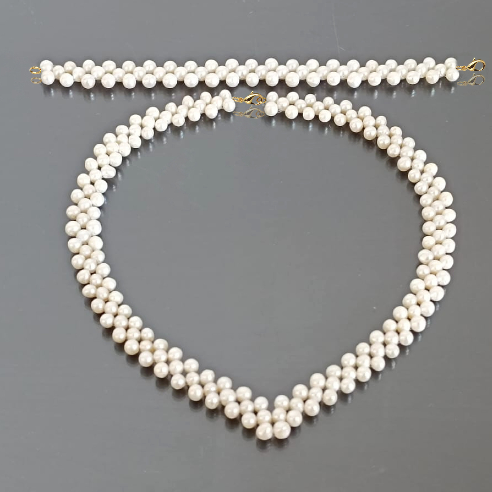 Descoperă delicatețea autentică a unui set cu perle naturale, creat pentru a aduce un plus de eleganță fiecărui moment special. Colierul și brățara, lucrate manual cu perle albe de 5-6 mm și calitate AA+, încadrează cu subtilitate linia gâtului și a încheieturii, accentuând frumusețea naturală a fiecărei ținute.