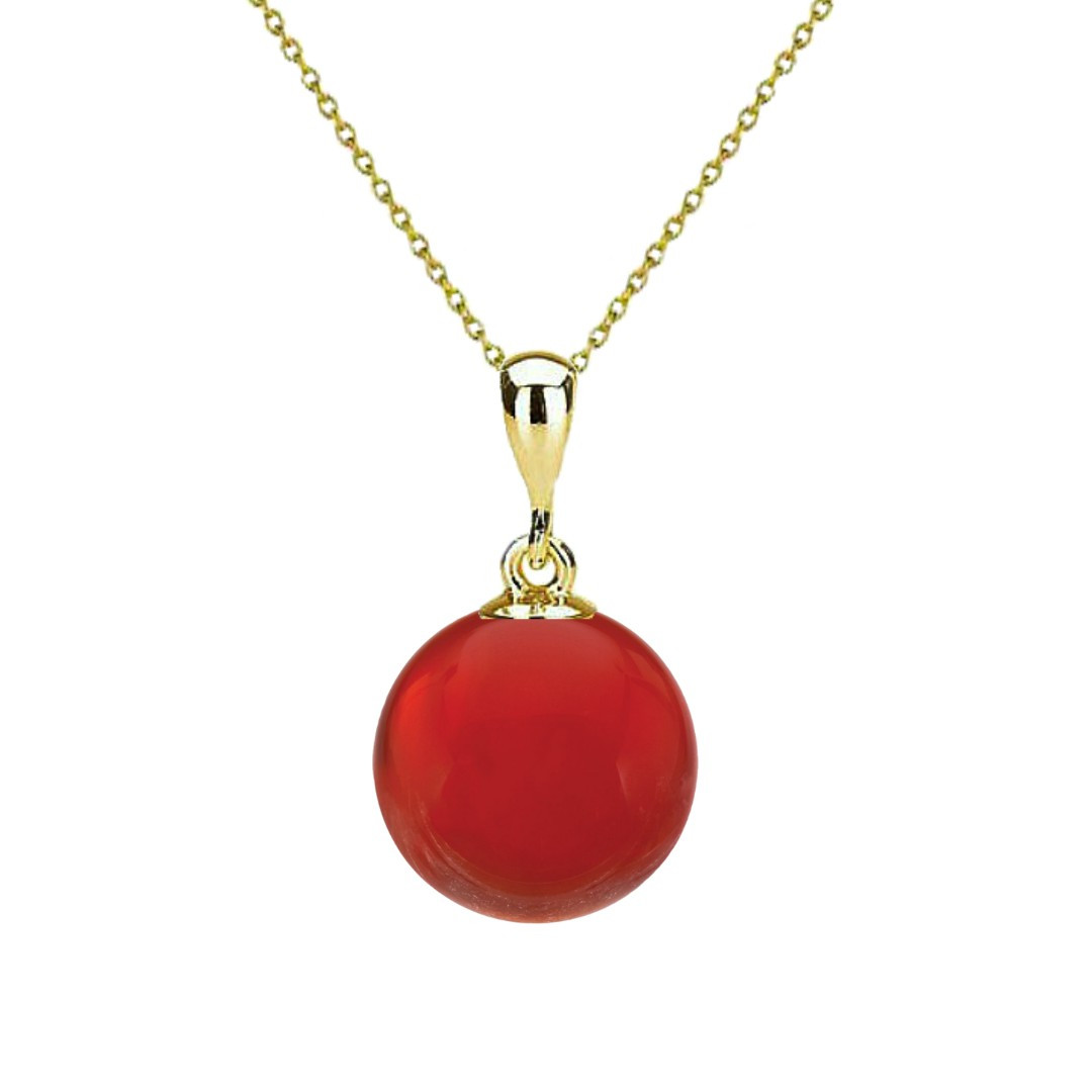 Un pandantiv din aur galben de 14 karate cu o piatra semipretioasa naturala de carneol, marimea 10 mm, pe un lantisor de aur galben de 14 karate. Lungimea lantisorului de aur galben de14 karate este de 45 cm.