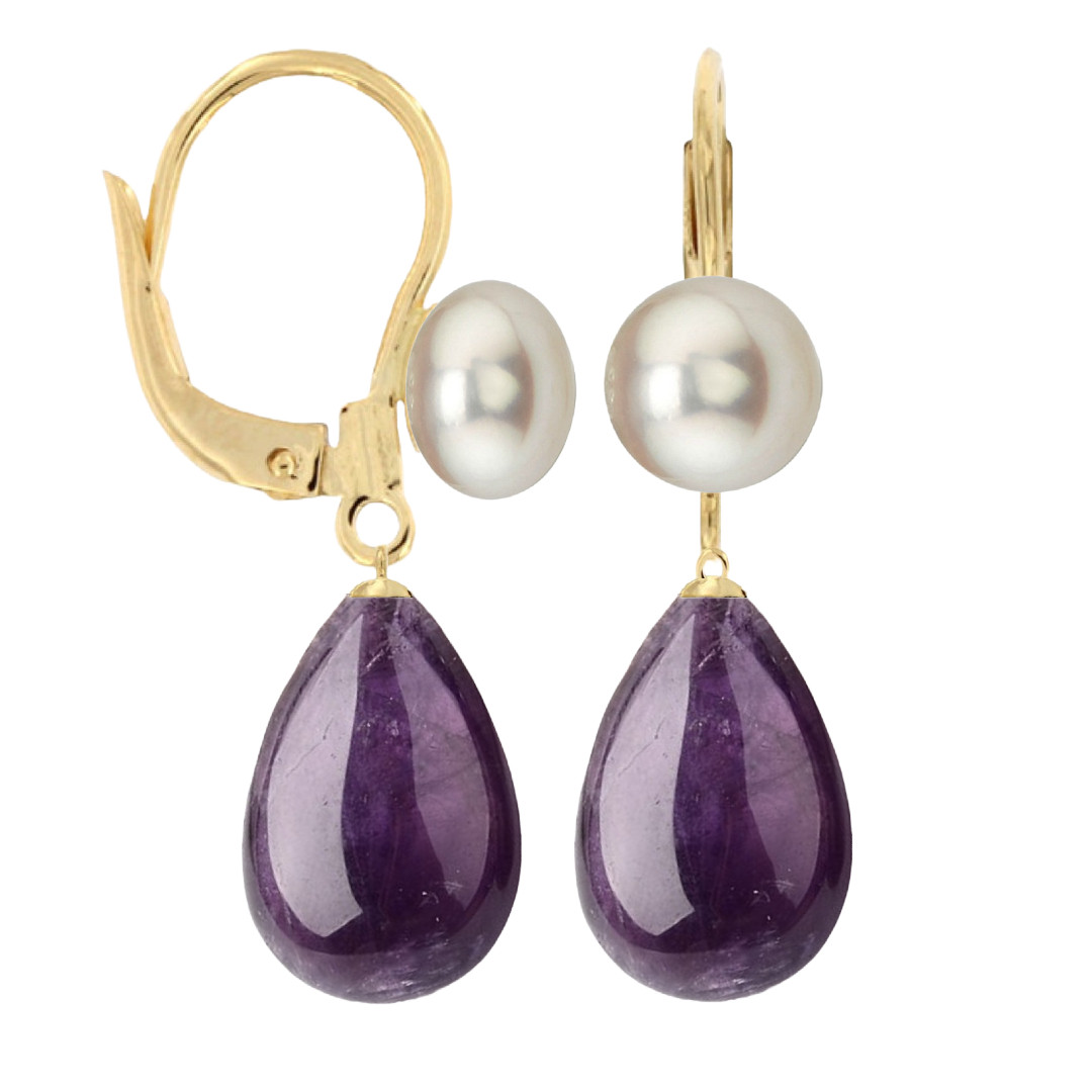 KASKADDA® Cercei Perle Albe și Ametist Natural, Formă Lacrimă, Aur Galben 14K – Model Princess | KASKADDA®