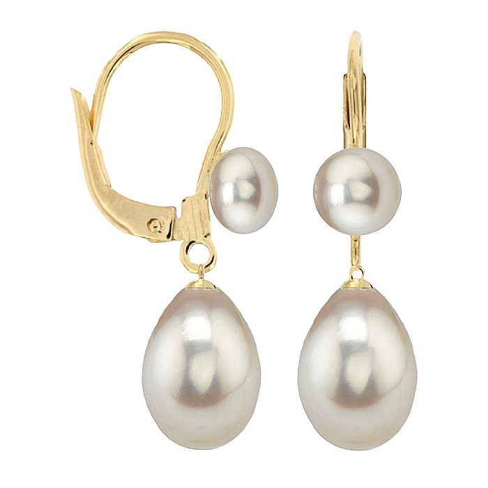 O apariție regală – acești cercei cu perle mari albe, în formă lacrimă, sunt completați de perle tip buton și montați pe tortiță închisă din aur galben 14K (aur 585). Bijuterie unică, cu un aer nobil, dedicată momentelor speciale.