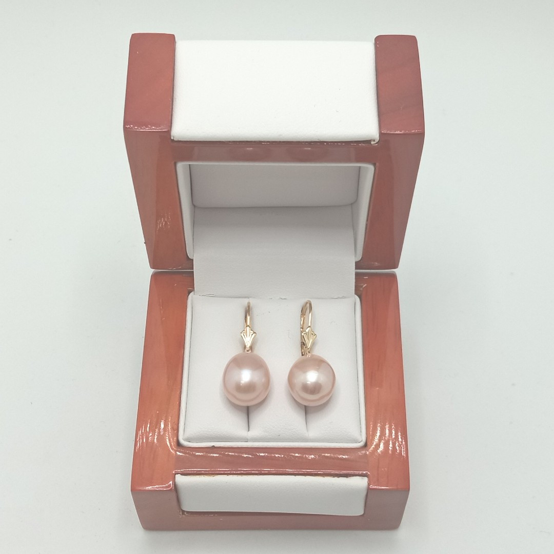 O pereche elaganta de cercei cu perle lavandă naturale de 11/9 mm, montate în aur galben 14K (aur 585). O bijuterie rafinată, o pereche de cercei cu perle mari în formă de lacrimă și luciu spectaculos, destinată femeilor care iubesc nuanțele fine și bijuteriile rare.