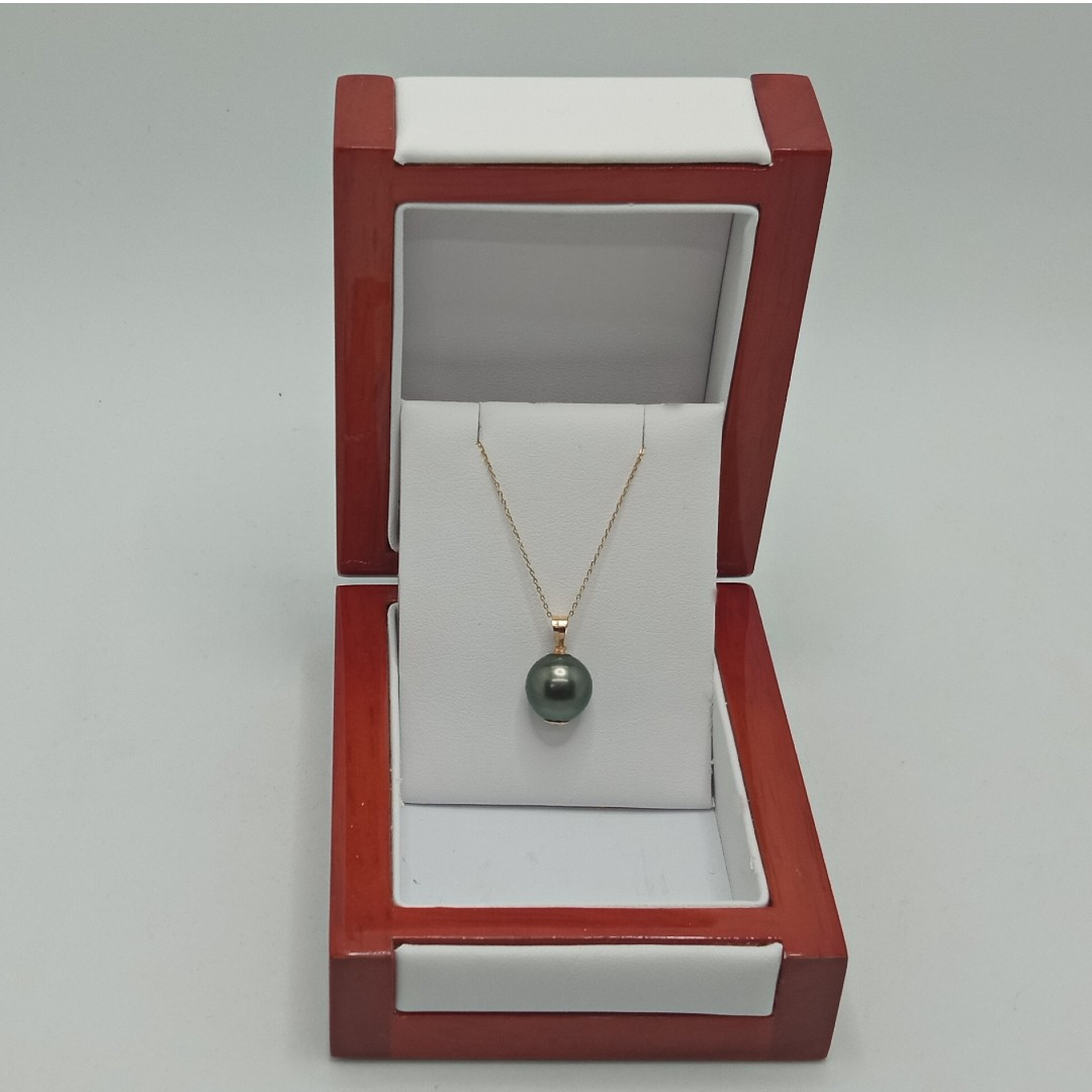 Un colier cu perlă naturală Tahitiană de 10-11 mm este o declarație subtilă de forță și rafinament. Această perlă rară, de formă rotundă și luciu tip oglindă, este montată într-un pandantiv elegant din aur galben 14K (aur 585), completat de un lănțișor fin care oferă echilibru și grație întregii bijuterii.
