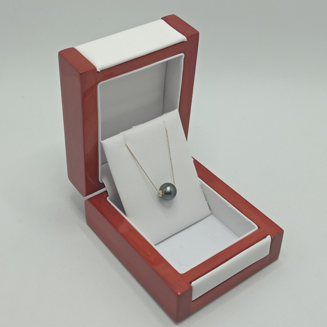 Un colier cu perlă naturală Tahitiană este definiția rarității transformate în eleganță pură. O singură perlă rotundă, perfect proporționată, cu luciu tip oglindă, devine centrul unei bijuterii create pentru a atrage subtil și a rămâne memorabilă. Montată în aur galben 14K (aur 585), această perlă de 8-9 mm reflectă lumina asemenea unei suprafețe de apă calmă – fină, profundă, misterioasă.
