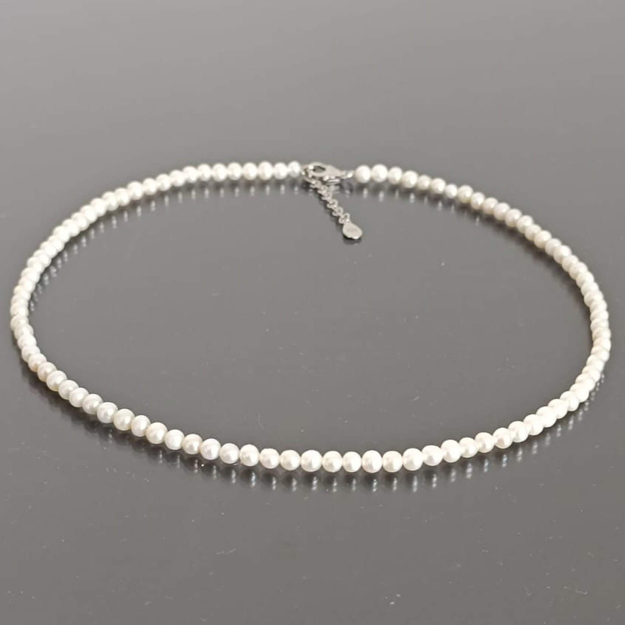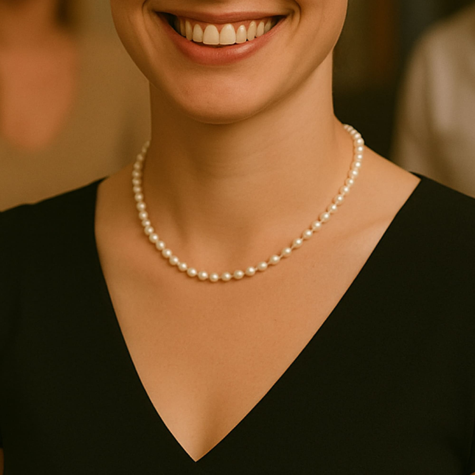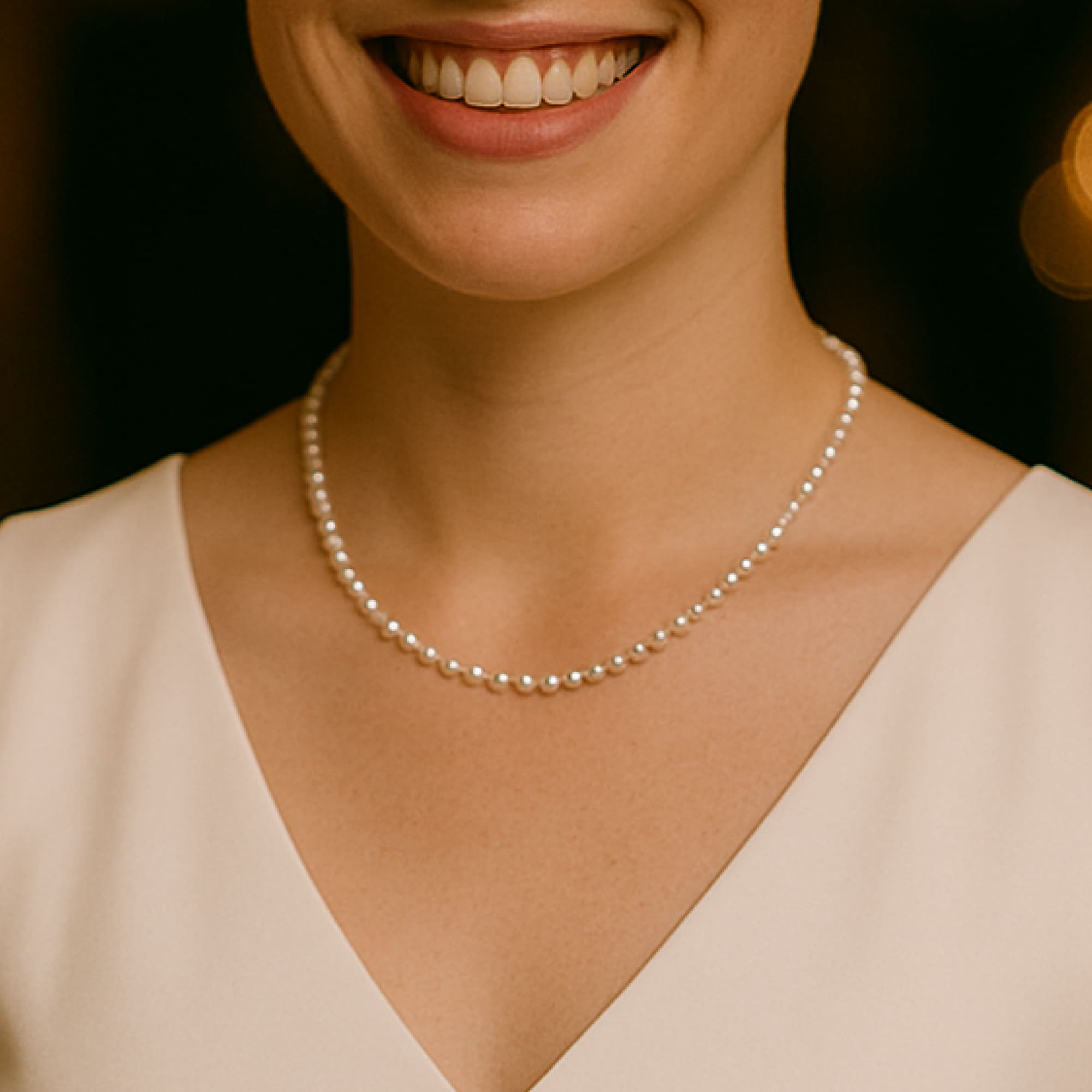 Acest colier cu perle la baza gâtului este expresia pură a eleganței tăcute. Realizat din perle naturale albe, mici, rotunde, de 4–5 mm, colierul se așază delicat la baza gâtului, luminând zona cu o strălucire blândă și naturală.