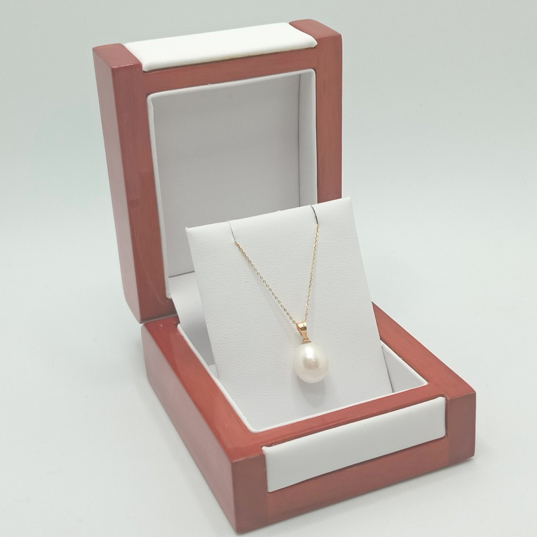 Montat într-un pandantiv din aur galben de 14K (aur 585), colierul are un lănțișor de 45 cm ce se așază perfect la baza gâtului. Perla lacrimă albă, cu dimensiuni de 12/9 mm, impresionează prin forma sa echilibrată și strălucirea profundă, tip oglindă.