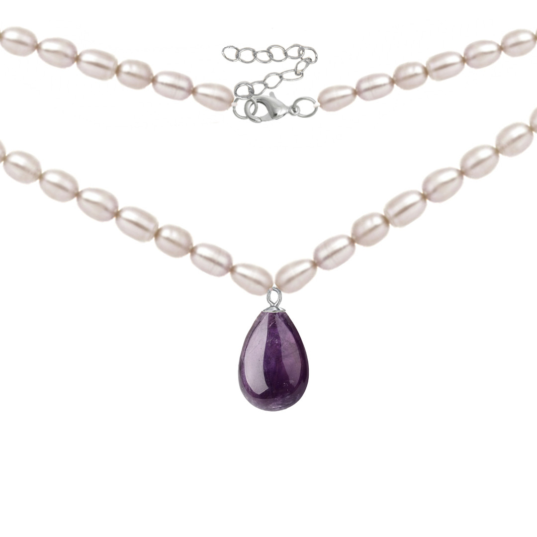 Un colier cu perle naturale și pandantiv de ametist în formă de lacrimă, montat cu argint 925. O bijuterie cu rafinament feminin, ideală pentru a fi purtată sau oferită cu drag.