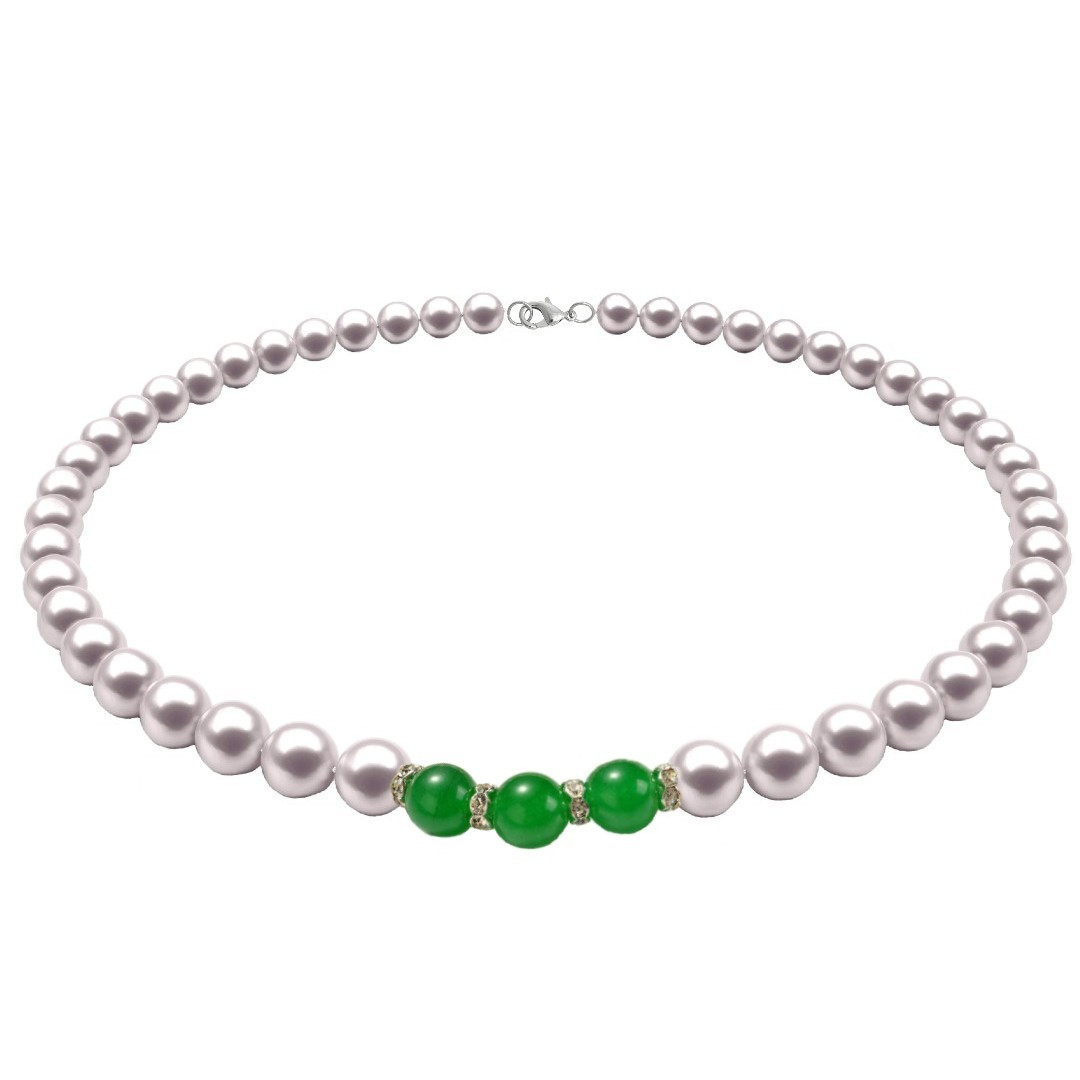 Un colier cu perle naturale albe și jad verde malaezian – o bijuterie echilibrată, feminină și elegantă, montată cu închizătoare din argint 925. Ideal pentru a fi purtat sau oferit cu drag.