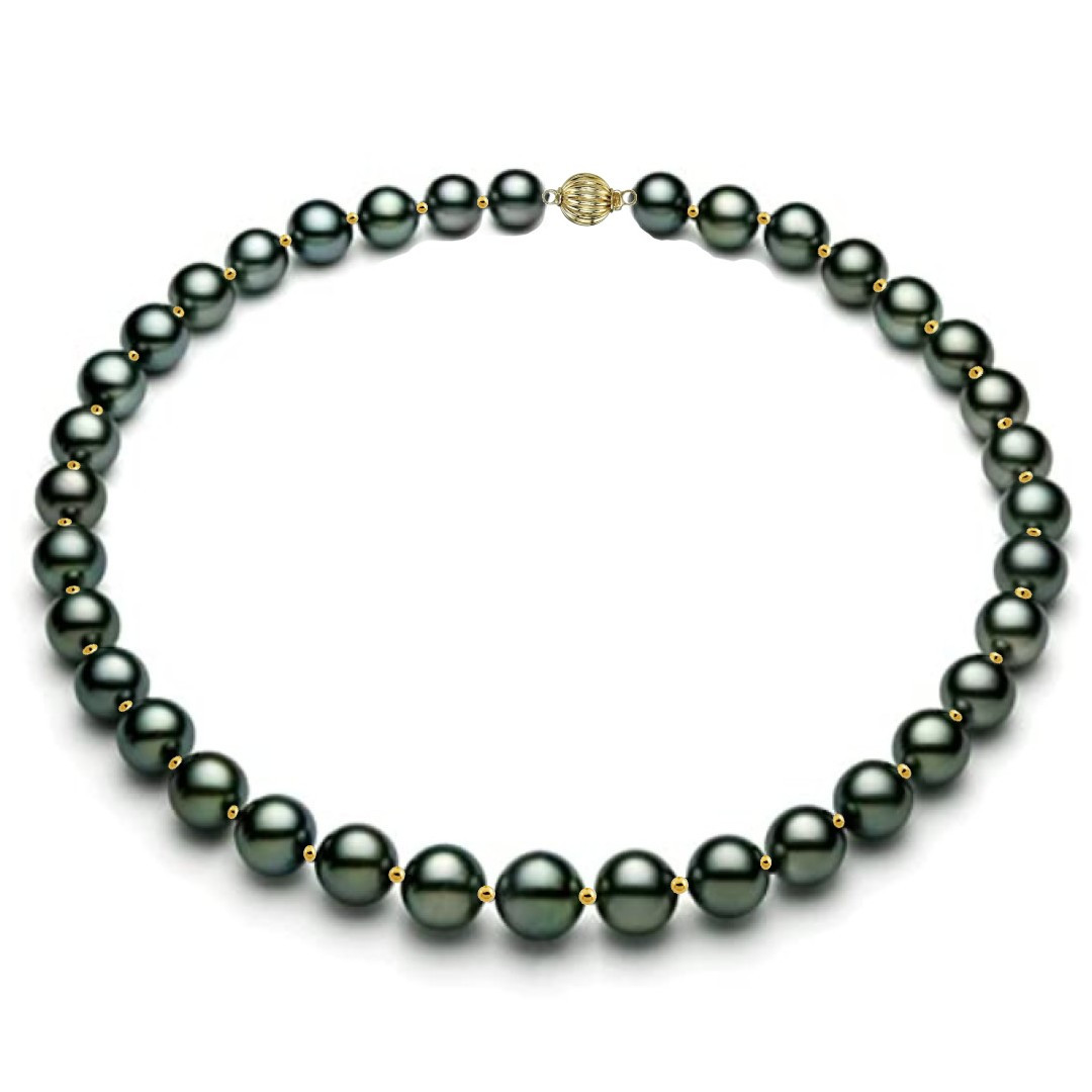 Un colier cu perle Tahitiene naturale, montat manual cu bile decorative și închizătoare din aur galben 14K. Perle rotunde, de 9–11 mm, calitate AAA, un design elegant și luxuriant, pentru femeile care caută o bijuterie rară, autentică și de colecție. Ideal ca dar de prestigiu.