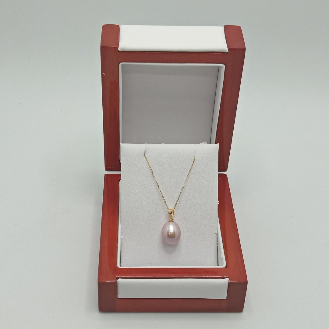 Colier cu perlă naturală lavandă, rară, de 11/9 mm, în formă de lacrimă, montată în pandantiv de aur galben 14K (aur 585). Bijuterie de colecție, cu valoare durabilă – un cadou sofisticat și memorabil.