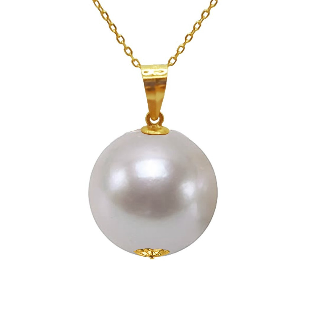 Această perlă naturală albă, cu o dimensiune impresionantă de 12,5–13 mm, este rotundă și perfect echilibrată, având un luciu tip oglindă și o suprafață netedă – trăsături definitorii pentru o perlă de calitate AAA. Pandantivul din aur galben de 14K (aur 585), împreună cu lănțișorul asortat de 45 cm, încununează elegant această piesă rară.