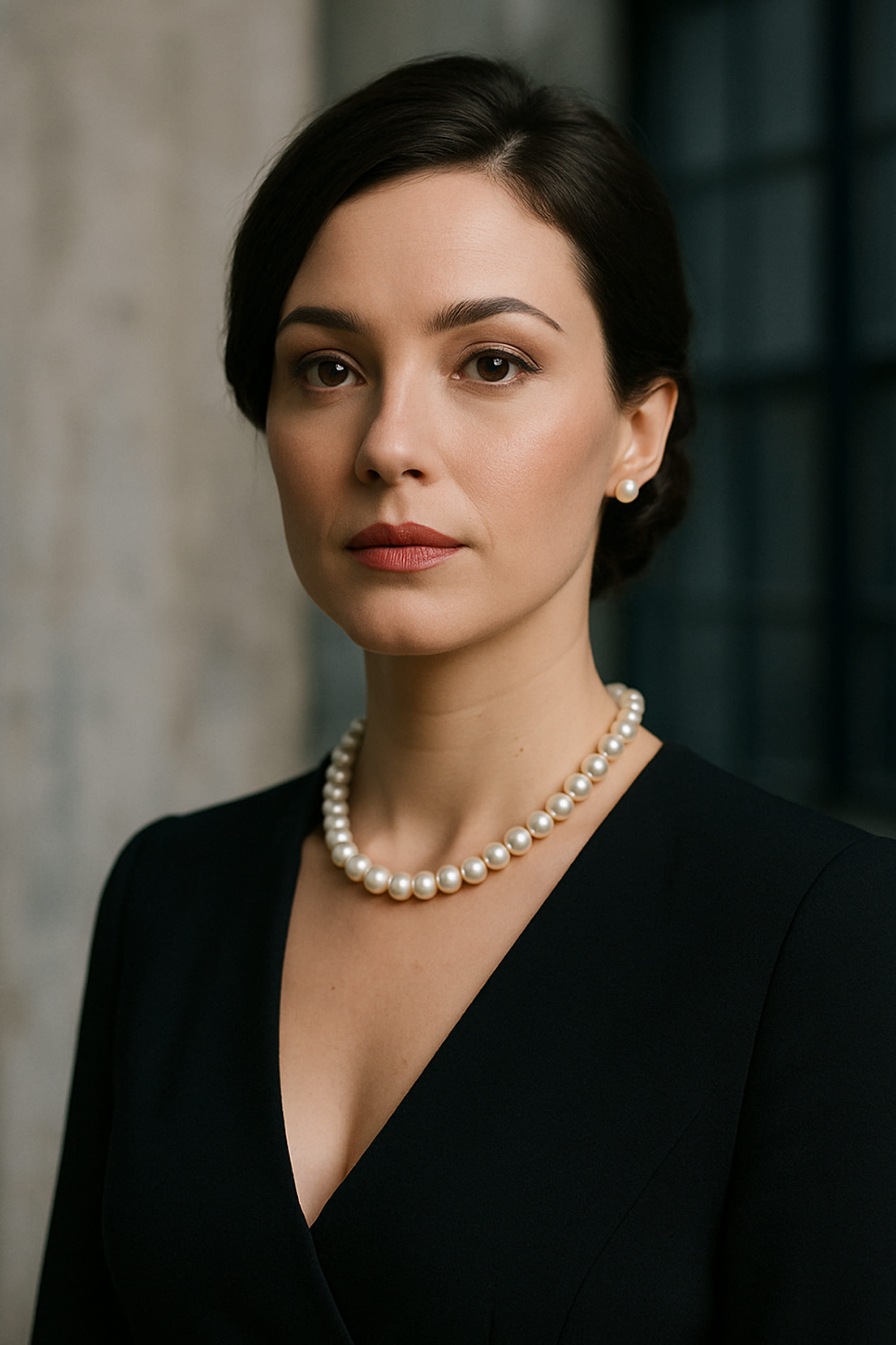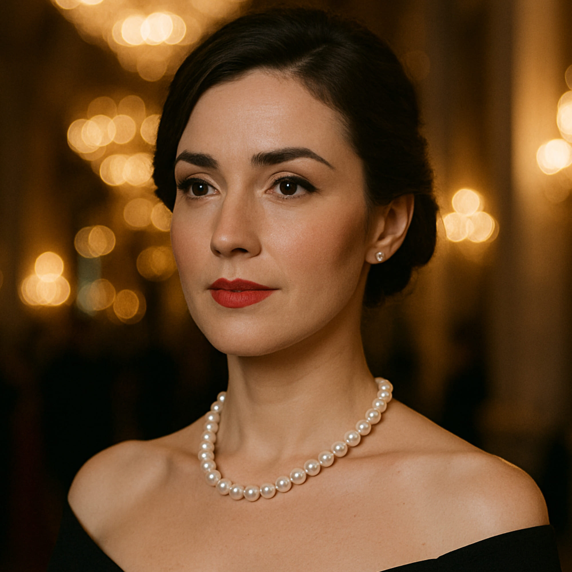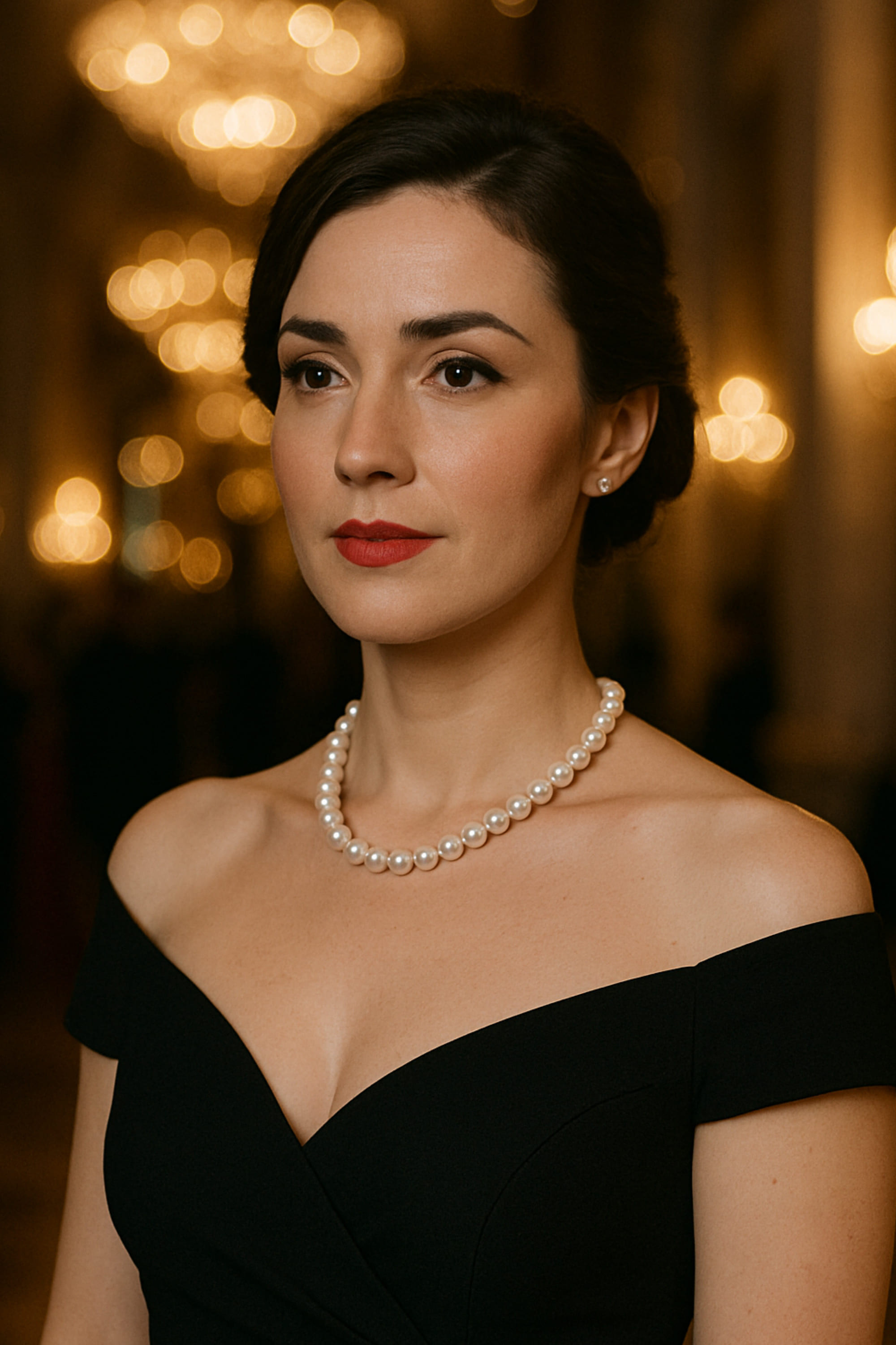 Poartă un colier cu perle la baza gâtului care spune exact ce trebuie – clar, simplu, dar cu o forță tăcută care lasă impresie.