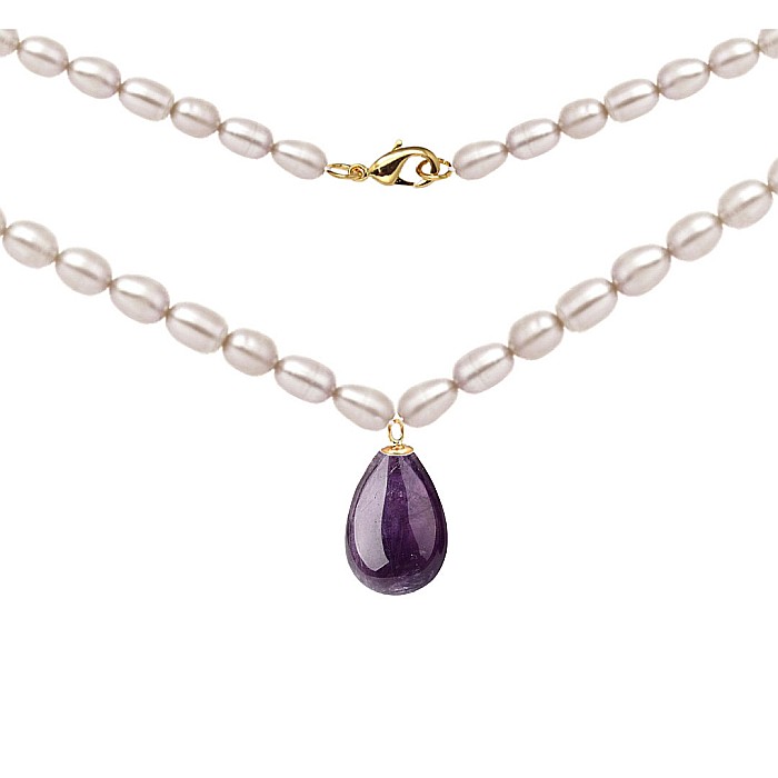 Un colier cu perle naturale și ametist în montură de aur este alegerea perfectă pentru femeile care preferă bijuteriile cu semnificație – rafinate, dar expresive, elegante, dar ușor de purtat.