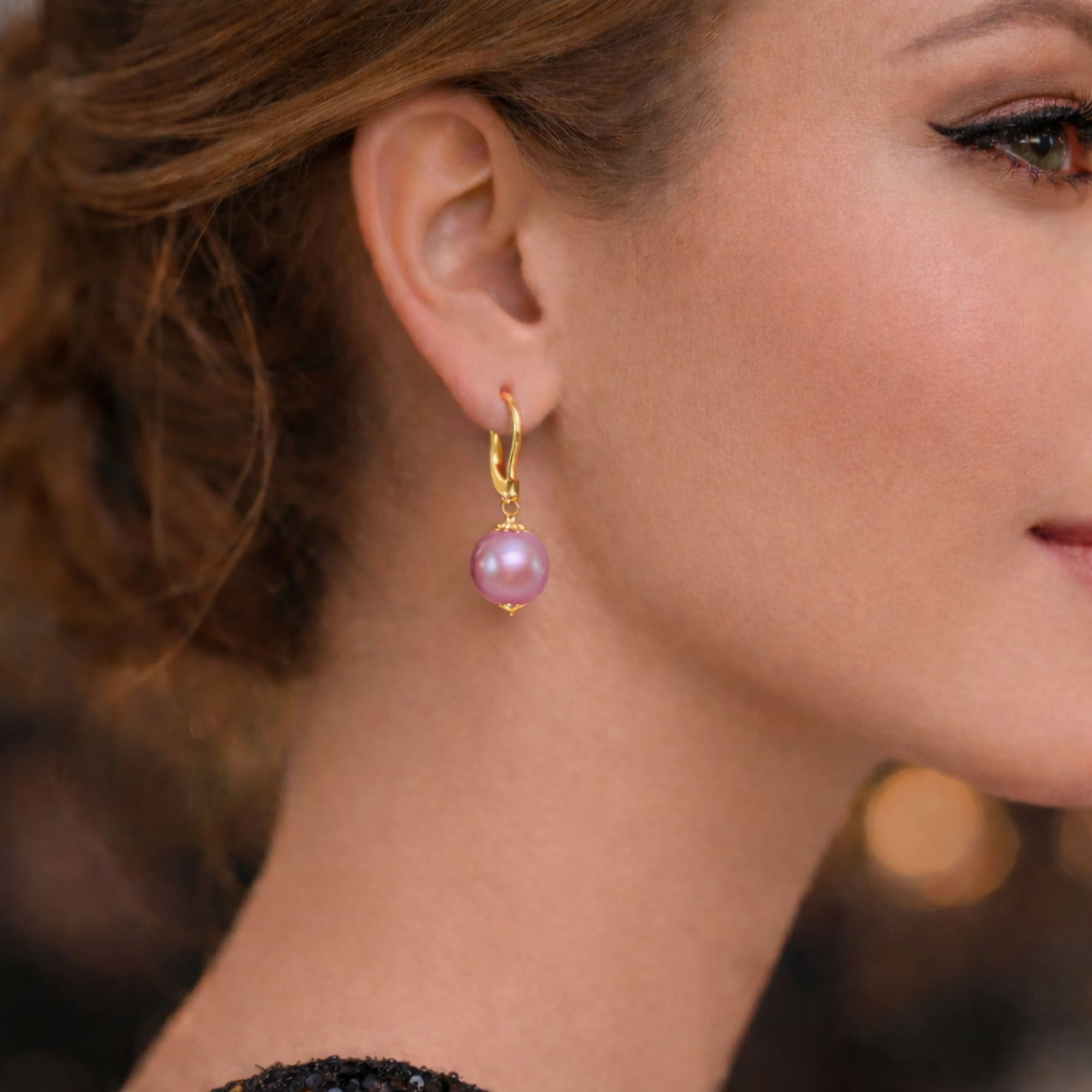 Se asortează perfect cu bijuterii fine din aur galben sau cu alte piese discrete. Pot fi purtați singuri sau alături de un colier cu perle lavandă.