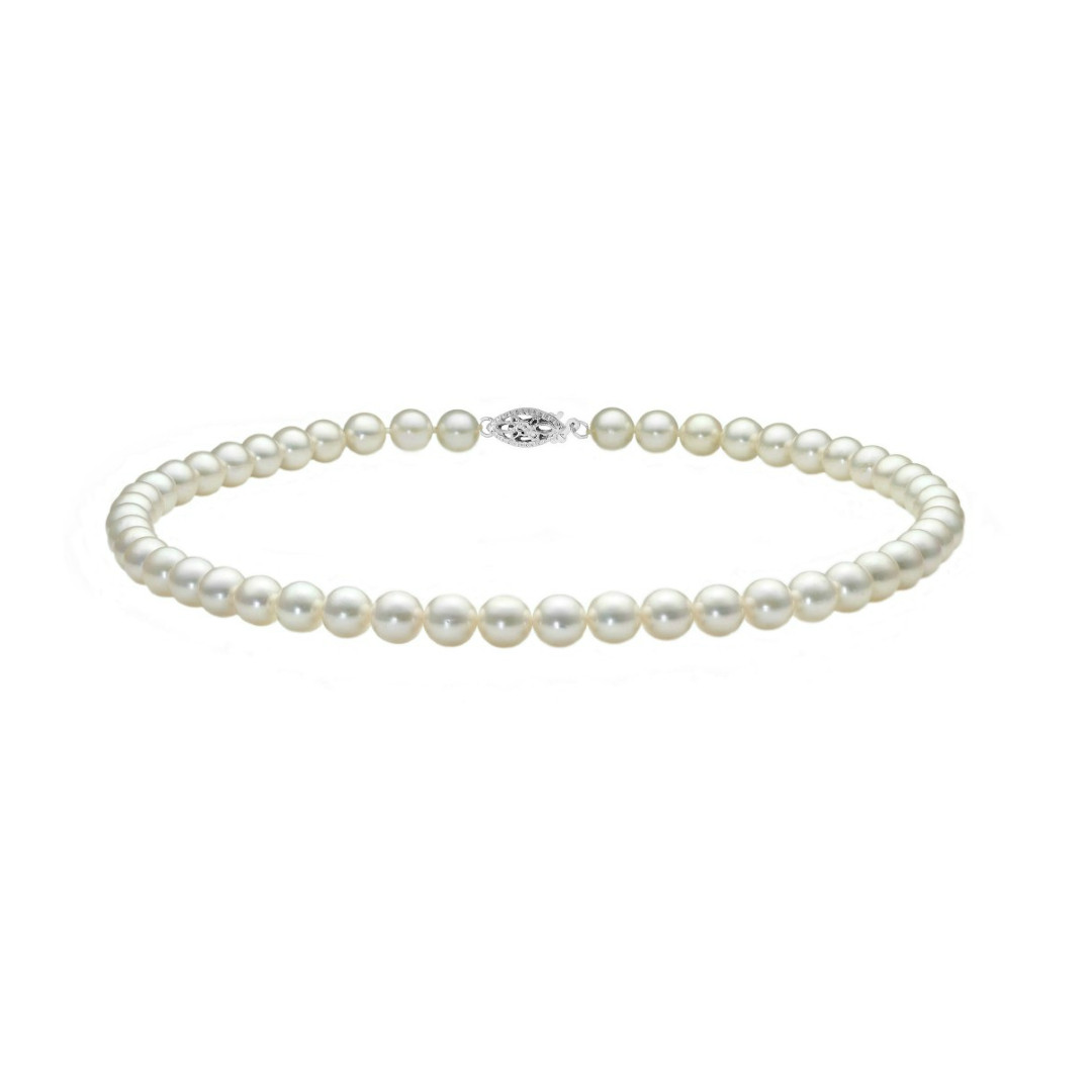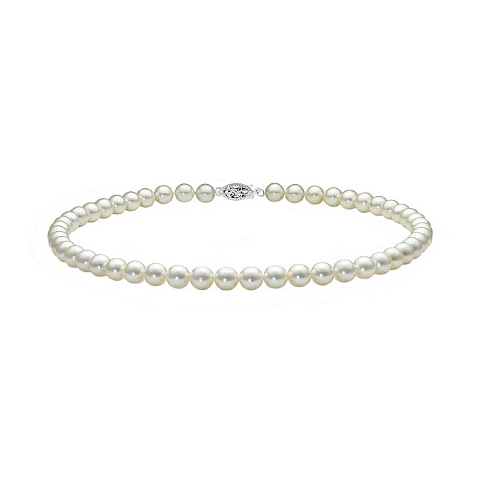 Un colier cu perle Akoya japoneze, perfect rotunde și strălucitoare, de 5,5–6 mm, montate cu o închizătoare filigranată elegantă din aur alb 14K. Bijuterie delicată și rafinată, ideală pentru un cadou subtil și memorabil.