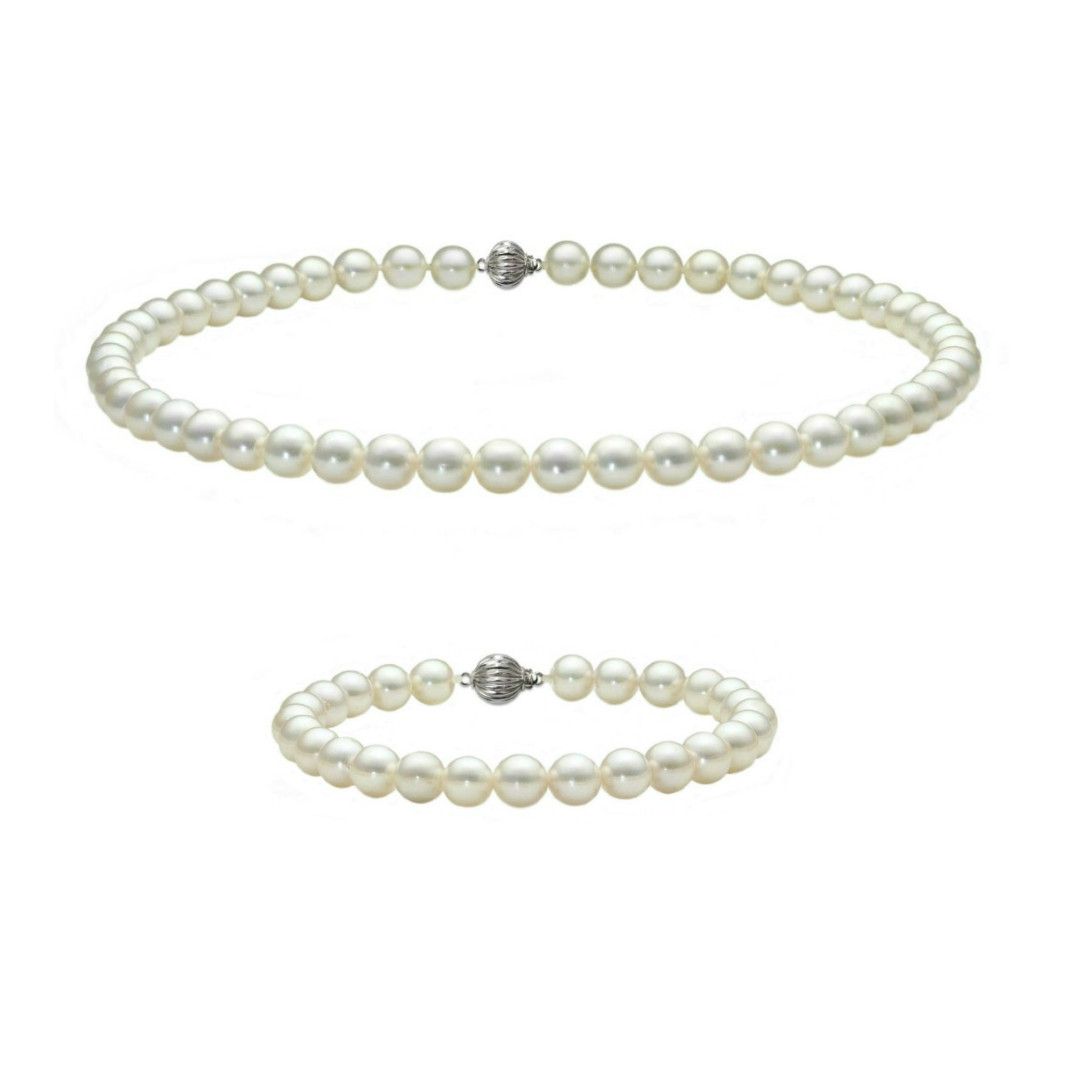 Un set cu perle Akoya japoneze este o alegere care trece testul timpului – subtil, elegant și plin de rafinament. Acest model reunește două piese esențiale: un colier și o brățară create din perle japoneze autentice de 5,5–6 mm, perfect rotunde, cu luciu metalic intens și suprafețe aproape fără imperfecțiuni. Închizătorile sferice din aur alb de 14K completează discret designul, adăugând un accent sofisticat, dar modern.