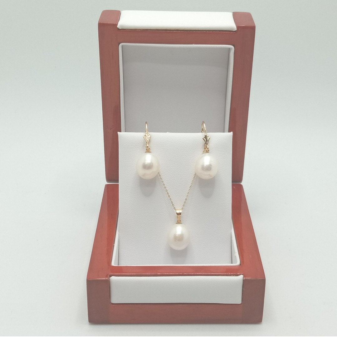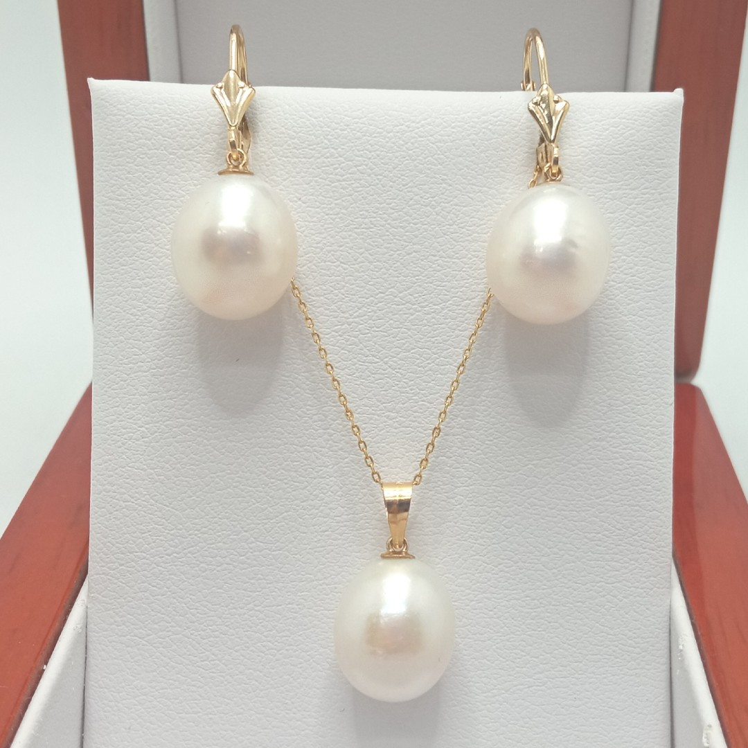 Un set cu perle mari și aur galben de 14K, format din colier cu pandantiv și cercei în formă lacrimă. Perlele albe naturale, rare, de 12/9 mm, sunt piese de colecție, cu luciu tip oglindă și calitate AAA+. Bijuterie cu valoare autentică, ideală pentru un cadou exclusivist.