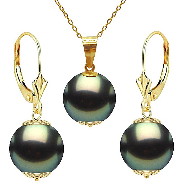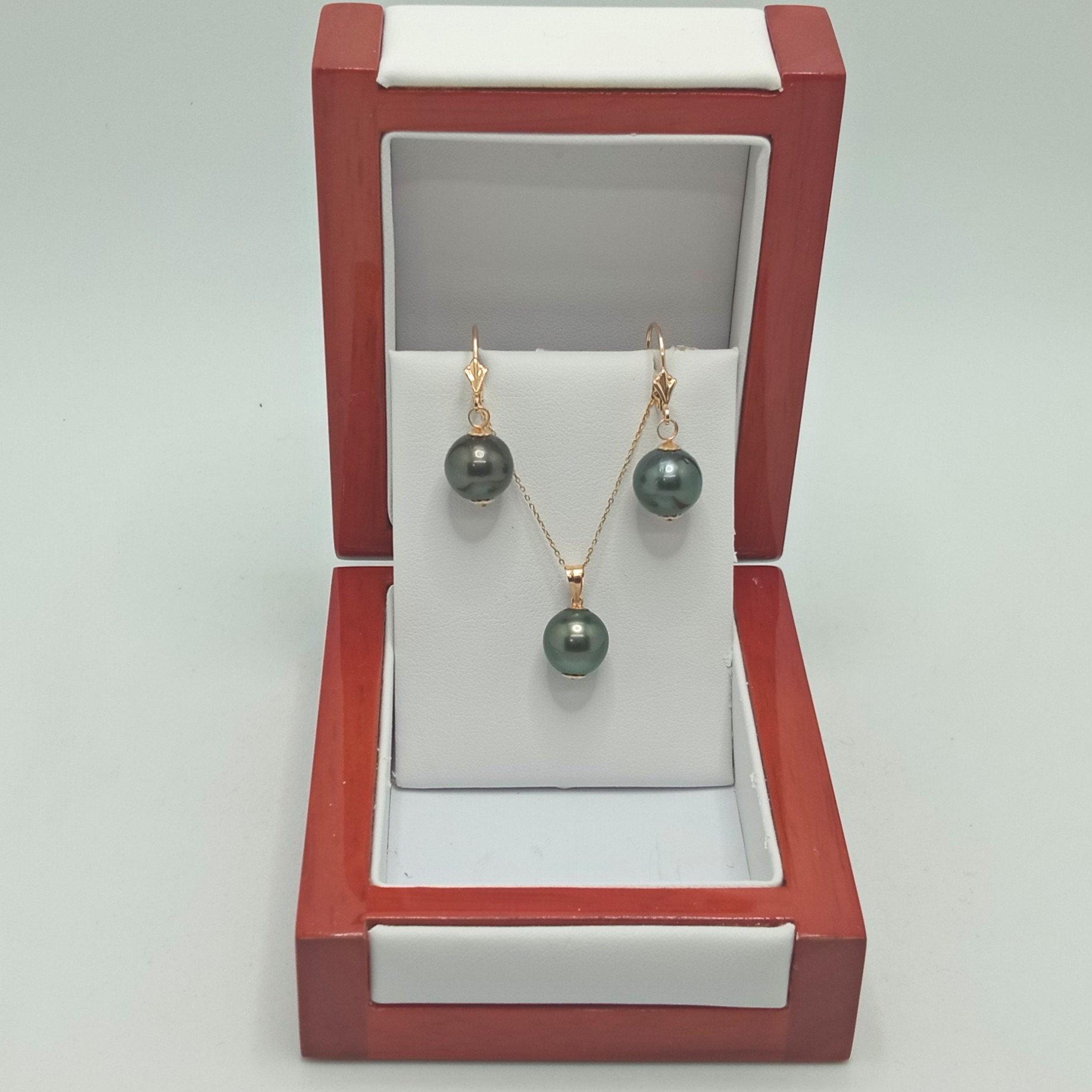 Set Perle Tahitiene – Colier cu Pandantiv și Cercei, Aur Galben 14K, Perle Naturale 8-9 mm, Calitate AAA | KASKADDA®