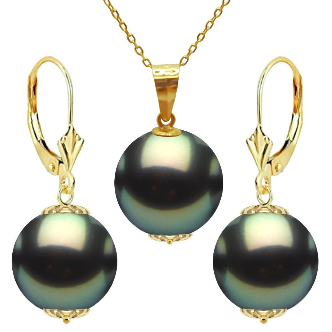 KASKADDA® Set Perle Tahitiene – Colier cu Pandantiv și Cercei, Aur Galben 14K, Perle Rotunde 10-11 mm, Calitate AAA | KASKADDA®