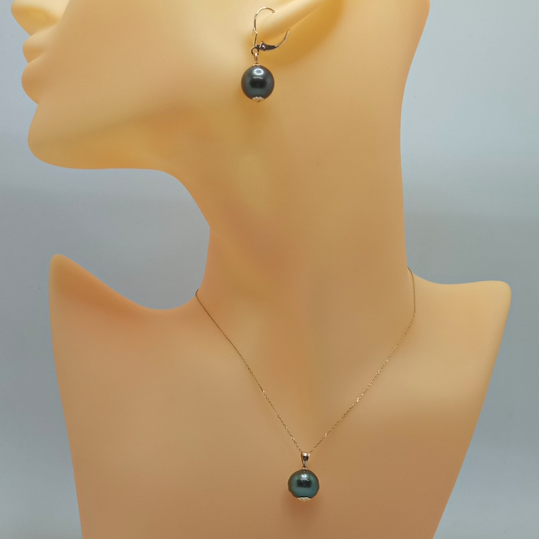 Un set cu perle Tahitiene și aur galben de 14K, rar și spectaculos, cu perle rotunde de 10-11 mm si luciu tip oglindă. Colierul cu pandantiv și cerceii eleganți aduc o notă de lux natural, într-un cadou de colecție, livrat în cutie premium.