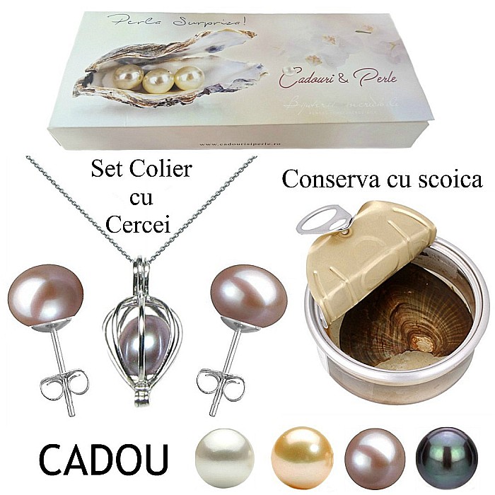 Un cadou original compus dintr-o conserva ce contine o scoica cu o perla naturala, un pandantiv de argint 925 cu un lantisor de argint 925 cu lungimea de 43 cm si o pereche de cercei din argint cu surub cu perle naturala lavanda de 7 mm. Scoica se scoate din conserva si in ea se descopera o perla. Apoi, pandantivul se desface, se aseaza perla si se pune pe lantisor.