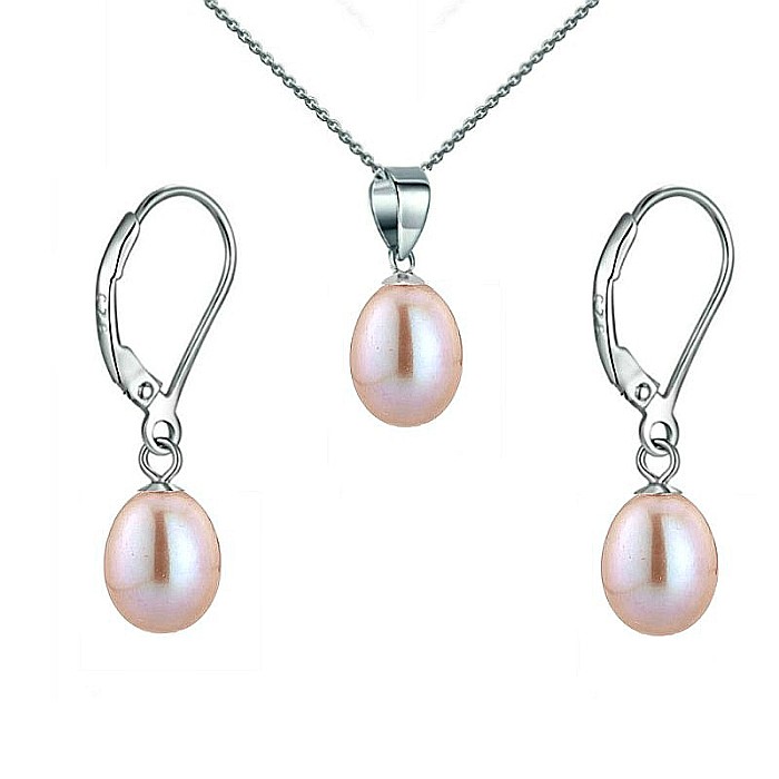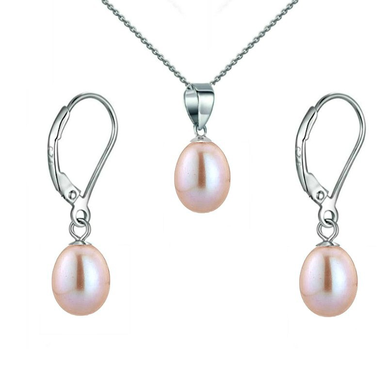 Un set cu perle lavandă și argint rodiat 925, compus din colier cu pandantiv și cercei cu tortiță închisă. Perle naturale în formă lacrimă, de 5/8 mm, cu nuanță pastel rară și montură protejată împotriva oxidării. Cadou ideal, delicat și versatil.
